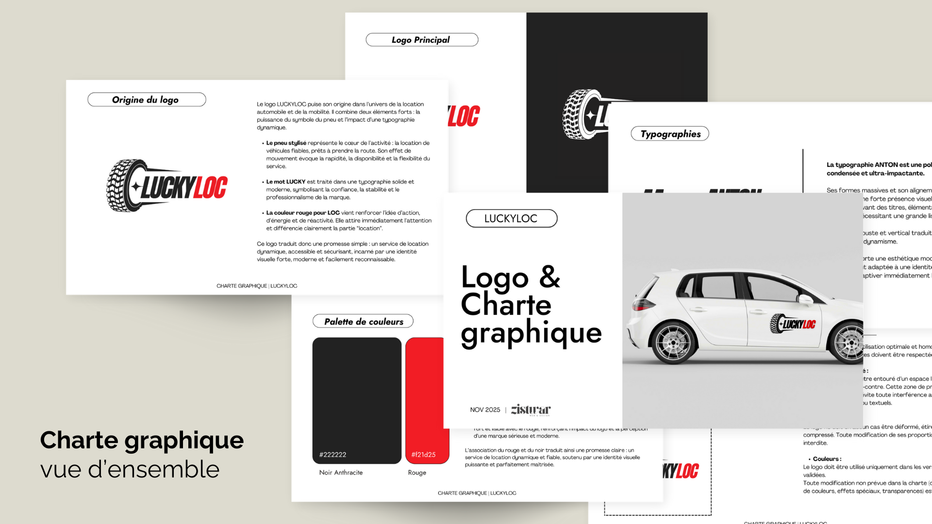 Le logo LUCKYLOC puise son origine dans l’univers de la location automobile et de la mobilité. Il combine deux éléments forts : la puissance du symbole du pneu et l’impact d’une typographie dynamique.